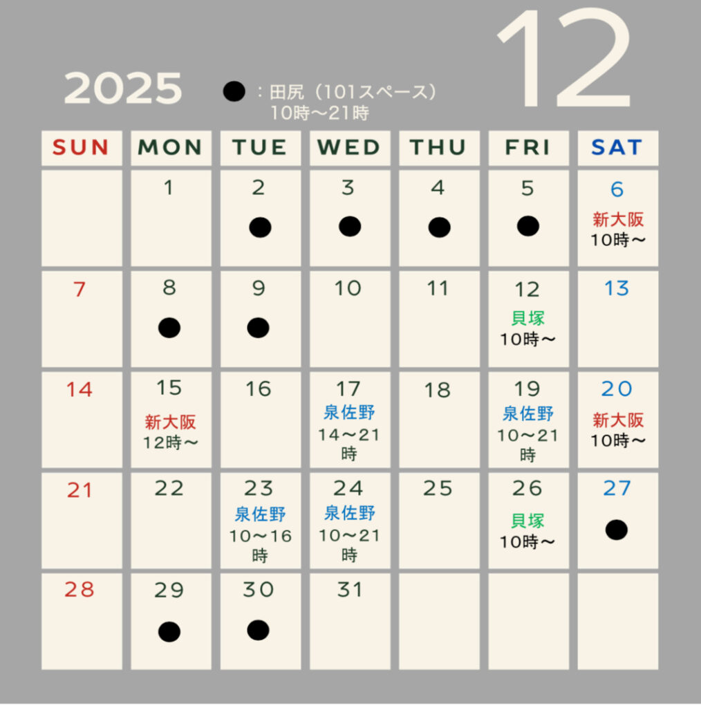 ⚪︎田 尻(カフェ空音横 南海吉見ノ里駅徒歩15分)🅿️有 貝 塚(南海貝塚駅徒歩1分) 泉佐野(泉の森ホール 2階 会議室) 新大阪(新大阪駅...